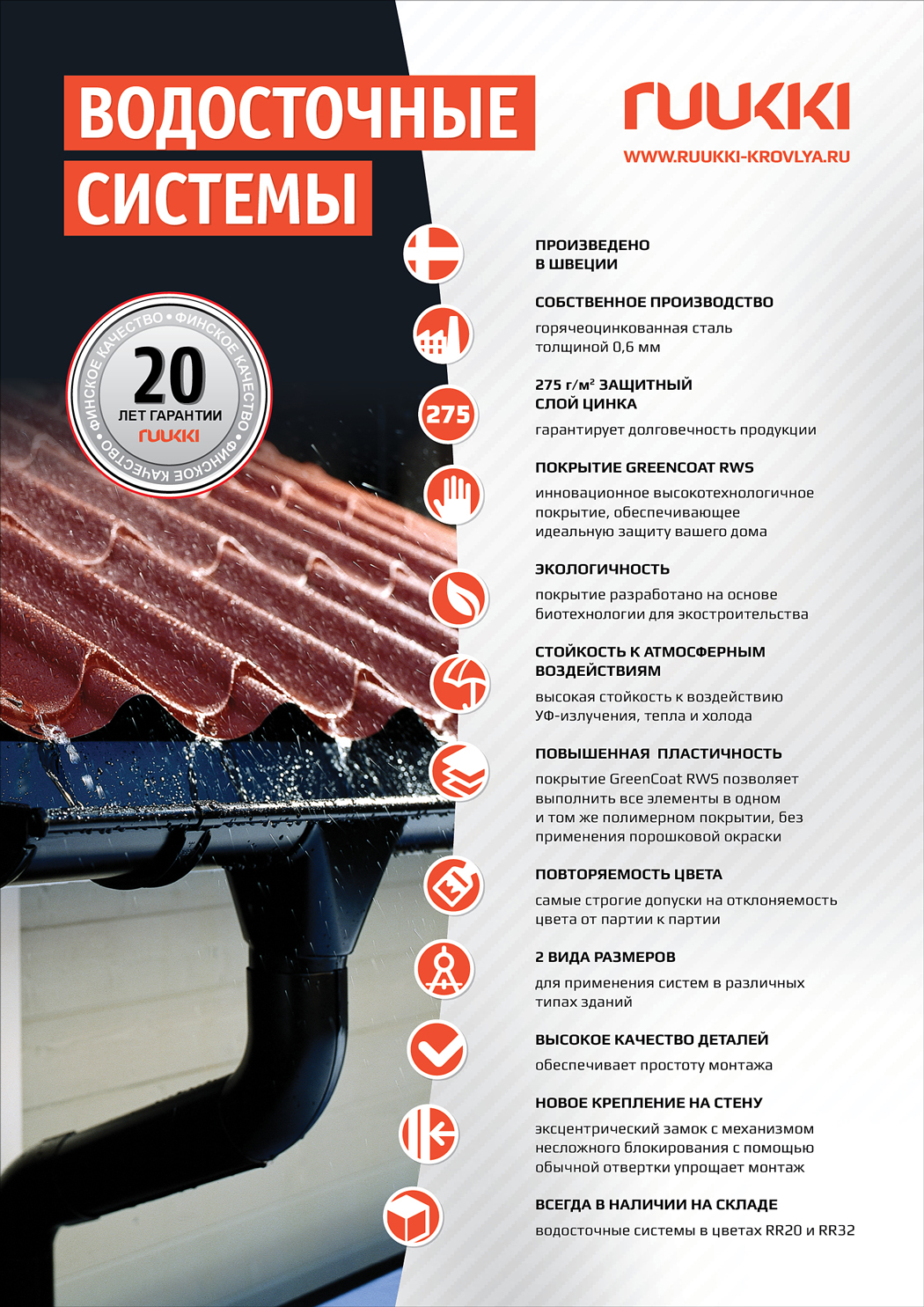 Водосточная система Ruukki Водосточные системы Ruukki эффективно удаляют ливневые сточные воды с крыши и обеспечивают безопасный отвод воды от конструкции. Благодаря полимерному покрытию, металлические водосточные системы Ruukki выдерживают длительную эксплуатацию в суровых климатических условиях. Кроме того, это гладкое покрытие и функциональный дизайн водостока предотвращают накопление мусора, поэтому водосточные системы Ruukki не требуют частого обслуживания. Водосточные системы Ruukki подходят для установки как в новых домах, так и при реставрации крыш. Наши водосточные трубы и желоба прекрасно сочетаются с кровлями из любого материала: металла, битума, натуральной черепицы.